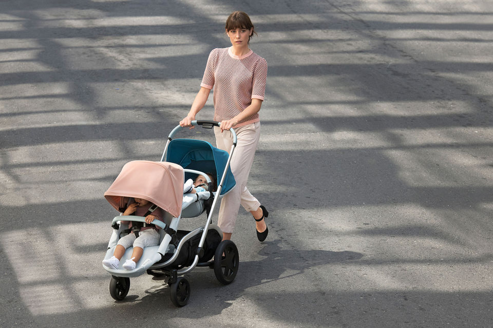 Here you can see how the Hubb evolves together with your expanding family! You'll start in a MONO configuration, with the pram. Switch to a seat, rearward facing, once your child can sit upright unsupported. Turn the seat around when you see your child is starting to explore the world. When your second child arrives, switch to the DUO configuration. Starting out with the pram-seat combo, you can evolve all the way to the hop-on/off board for your oldest!